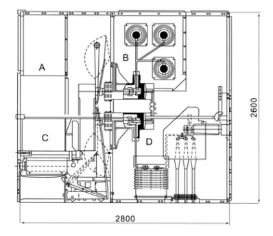 | 外形尺寸(宽 x深x高):1400x2800x2600 | 开关柜结构示意图A继电器仪表室 B母线室 C断路器室 D缆 |