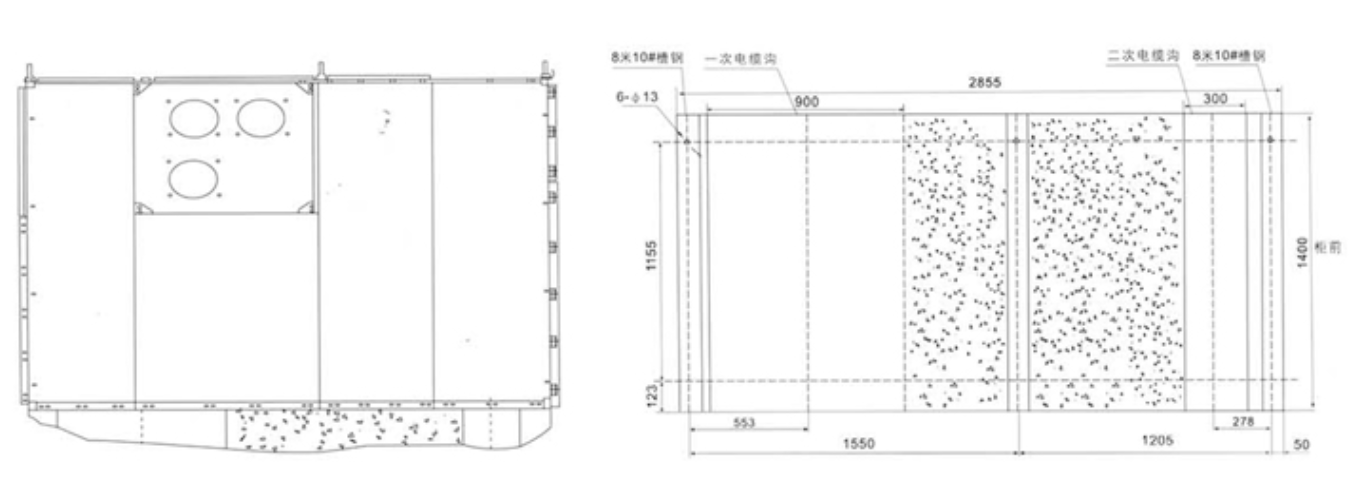 开关柜的外壳和隔板是用冷轧钢板经数控机床加工和折弯之后栓接而成。因此装配好的开关柜能保证结构尺寸的统一性。开关柜被隔为断路 器室室、主母线室、电缆室和继电器仪表室,各部分以接地的金属隔板分隔。